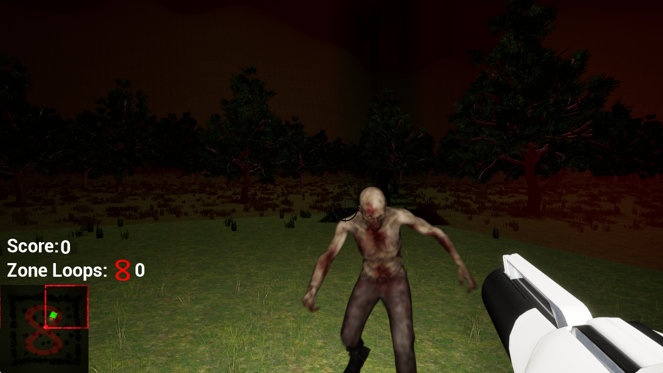 You are alone in a forest surrounded by zombies, lurking for you. You grab your weapon and start eliminating them. You must last as long as possible and get the highest kill value as possible, while taking into account staying in the safe zone. You will move in a loop, and with every loop you cut the zone, the difficulty of the game increases. Do not forget to support me on GMTKjame by voting. I worked hard on the game and I hope you like it. Thank you.